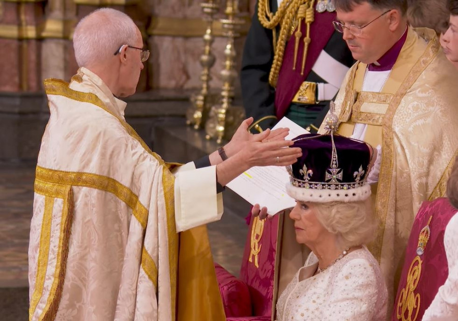 Ο Αρχιεπίσκοπος του Καντέρμπερι Τζάστιν Ουέλμπι τοποθέτησε το στέμμα του Αγίου Εδουάρδου στο κεφάλι του Καρόλου Γ'. Λίγο νωρίτερα, ο μονάρχης ορκίστηκε να υπηρετεί τους υπηκόους του και να προστατεύει την Εκκλησία της Αγγλίας της οποίας είναι ο ανώτατος ηγέτης.