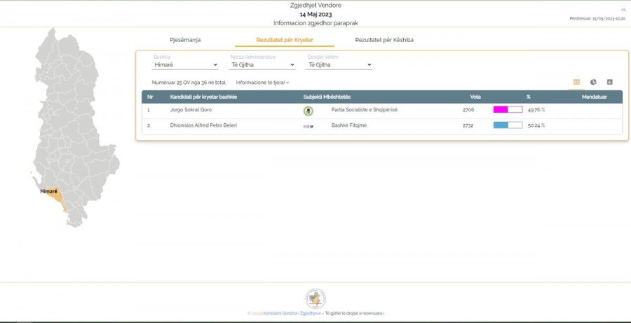 Ωστόσο οι Έλληνες της Χειμάρρας δικαιώθηκαν και ο Φρέντι Μπελέρης κατάφερε να επικρατήσει του αντιπάλου του και συμμάχου του Ράμα. Ο αρχηγός του κόμματος της Ομόνοιας έδωσε μεγάλη μάχη και κατάφερε να επικρατήσει με 50,24% στις αυτοδιοικητικές εκλογές σημειώνοντας διαφορά 0,48% από τον Γκιόργκι Γκόρο.