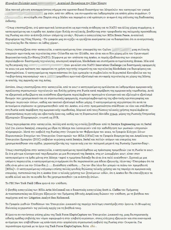 Στις 16 Μαΐου το υπουργείο Δικαιοσύνης των ΗΠΑ προχώρησε στην ανακοίνωση της άσκησης ποινικών διώξεων σε πέντε υποθέσεις αλλά και τεσσάρων συλλήψεων από πέντε διαφορετικά γραφεία εισαγγελέων της χώρας. Οι εξελίξεις προήλθαν από τις δράσεις της Disruptive Technology Strike Force, μια υπηρεσία που συστάθηκε πρόσφατα στις ΗΠΑ. Μεταξύ των υποθέσεων που απασχολούν το υπουργείο Δικαιοσύνης των ΗΠΑ, είναι και αυτή ενός 59χρονου Έλληνα επιχειρηματία από την Πάτρα, ο οποίος συνελήφθη στις 9 Μαΐου στο Παρίσι.