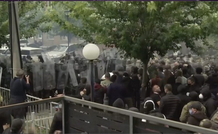 Οι διαδηλωτές απάντησαν πετώντας πέτρες και άλλα αντικείμενα ενώ πυρπόλησαν και όχημα της αστυνομίας του Κοσόβου.