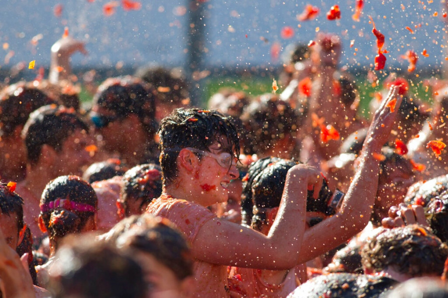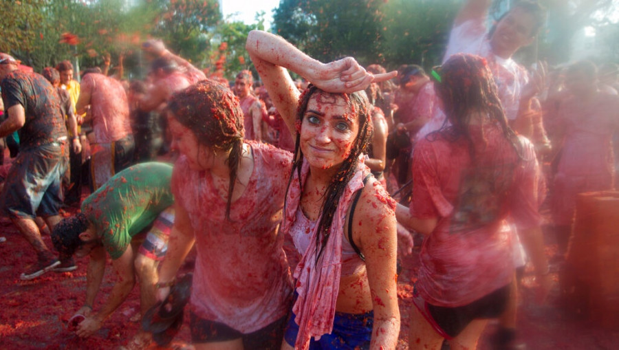 Φορτηγά φορτωμένα με παραγινωμένες ντομάτες κινούνταν στενά του χωριού, κοντά στη Βαλένθια, καθώς οι ντόπιοι γλεντούσαν πετώντας τα λαχανικά, βάφοντας τα πάντα κατακόκκινα.