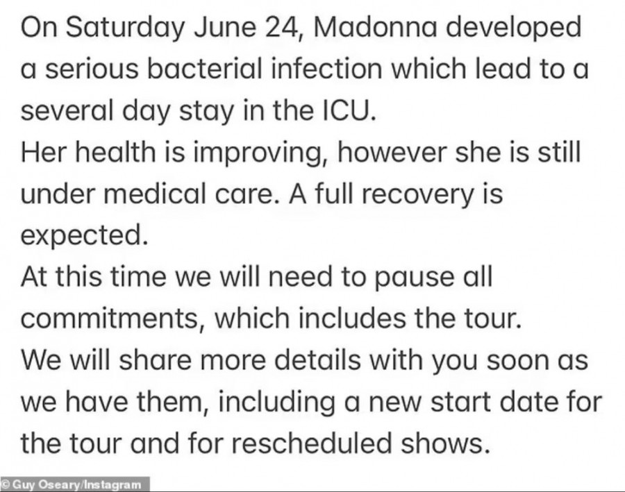 Δεν αποκάλυψε τις λεπτομέρειες της θεραπείας της Mαντόνα ή τις συνθήκες νοσηλείας της, επιβεβαίωσε όμως ότι μεταφέρθηκε στη ΜΕΘ το Σάββατο και ότι διαγνώστηκε με βακτηριακή λοίμωξη. Αποκάλυψε στη συνέχεια ότι η τραγουδίστρια αναγκάζεται να αναβάλει την έναρξη της περιοδείας της, για την οποία έκανε πρόβες εδώ και μήνες -και η οποία επρόκειτο να ξεκινήσει σε λίγες εβδομάδες- γράφοντας: «Αυτή τη στιγμή θα χρειαστεί να σταματήσει όλες τις δεσμεύσεις της, η οποία περιλαμβάνει την περιοδεία».