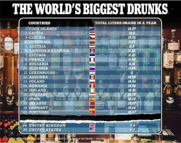 Την πρωτιά κατέχουν τα νησιά Κουκ, όπου κάθε άτομο καταναλώνει περίπου 13 λίτρα καθαρού αλκοόλ τον χρόνο -κάτι που «μεταφράζεται» σε περίπου 100 ποτήρια κρασί, σύμφωνα με τα στοιχεία του 2019 που έχει στην κατοχή της η CIA. Περισσότεροι από τους μισούς ενήλικες στα νησιά, πίνουν αλκοόλ.