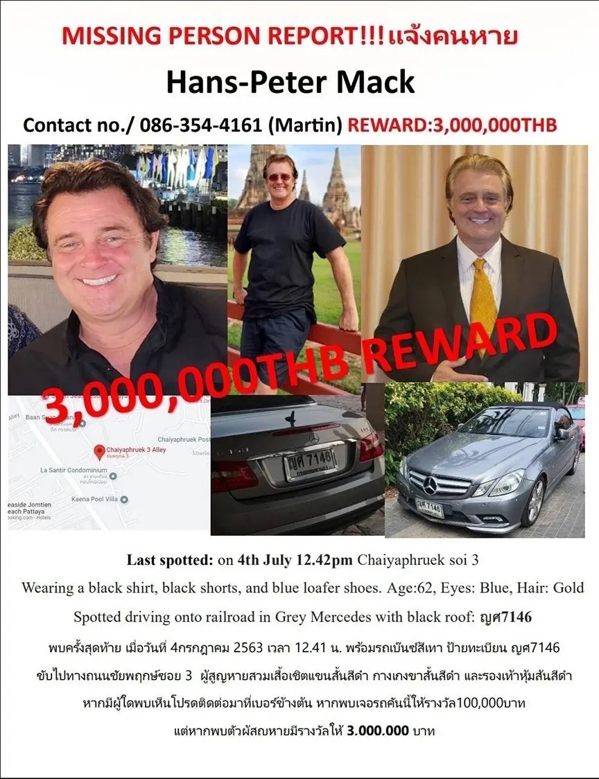 «Υπήρχε πρόθεση να καταστραφούν στοιχεία και η υπόθεση δείχνει ότι η εξαφάνιση του Χανς Πέτερ Μακ ήταν ύποπτη», δήλωσε ο αρχηγός ερευνών της επαρχιακής αστυνομικής περιφέρειας, Τιρατσάι Τσανμανμόρ. Ένας τοπικός πωλητής τροφίμων δήλωσε πως είδε δύο γυναίκες να βγαίνουν από το όχημα που ήταν σταθμευμένο εκεί λίγες μέρες νωρίτερα.