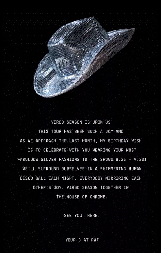 Η περιοδεία της Μπιγιονσέ ξεκίνησε στη Στοκχόλμη τον Μάιο και θα ολοκληρωθεί στο Κάνσας τον Οκτώβριο.Δεκάδες διάσημοι έχουν εμφανιστεί μέχρι στιγμής στις συναυλίες της, όπως η αντιπρόεδρος των ΗΠΑ, Κάμαλα Χάρις, ο σύζυγός της και η φίλη της Όπρα Γουίνφρι.