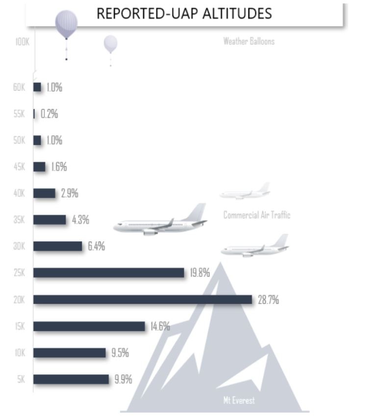 Τα περισσότερα UFO (28%) έχουν εντοπιστεί σε ύψος περίπου 20.000 ποδιών, λίγο χαμηλότερα από τα εμπορικά επιβατικά αεροπλάνα.