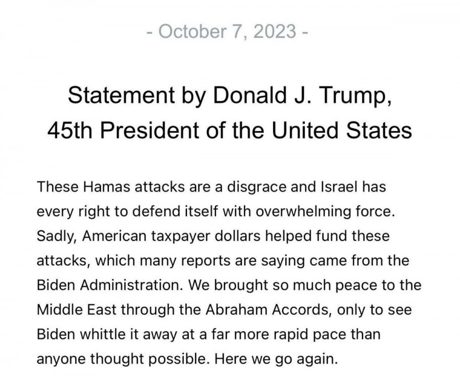 «Αυτές οι επιθέσεις της Χαμάς αποτελούν ντροπή και το Ισραήλ έχει κάθε δικαίωμα να αμυνθεί με όσες δυνάμεις διαθέτει. Δυστυχώς, τα χρήματα των Αμερικανών φορολογούμενων βοήθησαν για αυτές τις επιθέσεις, λόγω της πολιτικής Μπάιντεν. Φέραμε ειρήνη στην Μέση Ανατολή, μόνο και μόνο για να δούμε τον Μπάιντεν να την αποσυνθέτει με ταχείς ρυθμούς, πέρα από όσα θα πίστευε κανείς. Ξεκινήσαμε ξανά...»