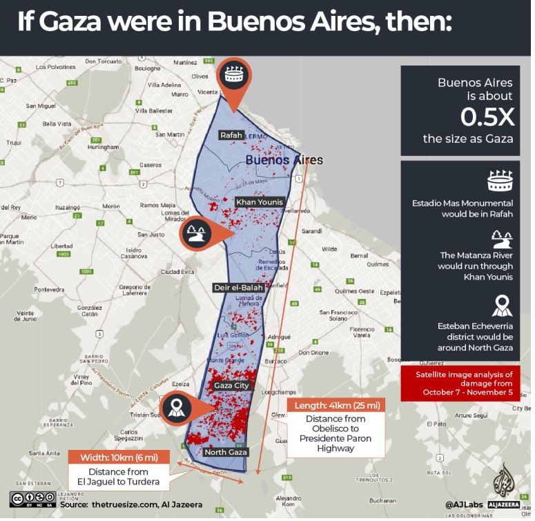 Η Λωρίδα της Γάζας έχει περίπου το ίδιο μήκος με το μήκος από τον Οβελίσκο μέχρι τον αυτοκινητόδρομο του Προέδρου Περόν, και τόσο πλάτος όσο από το Ελ Τζαγκέλ μέχρι την Τουρντέρα.