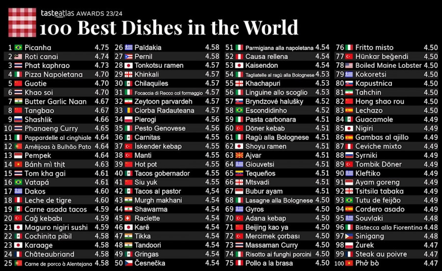 Τα αποτελέσματα της παγκόσμιας ψηφοφορίας για τις 100 καλύτερες κουζίνες και τα 100 καλύτερα φαγητά στον κόσμο για το 2023 έδωσε στη δημοσιότητα και φέτος το Taste Atlas