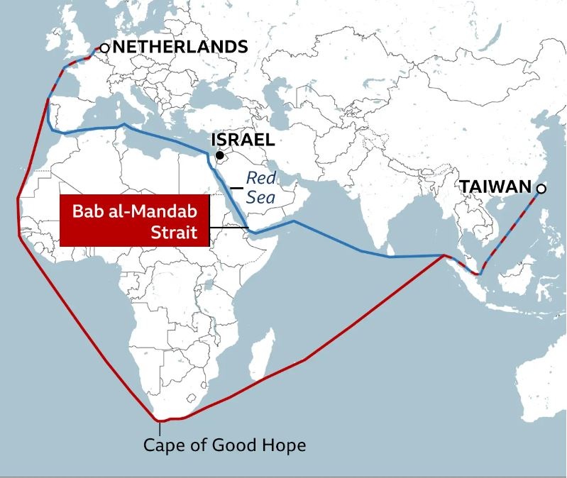 Ο πετρελαϊκός κολοσσός BP ανακοίνωσε τη Δευτέρα (18.12) ότι θα σταματήσει προσωρινά όλες τις αποστολές αργού μέσω της βασικής εμπορικής οδού. Η εναλλακτική διαδρομή, γύρω από το Ακρωτήριο Καλής Ελπίδας, προσθέτει περίπου 3.500 ναυτικά μίλια στο ταξίδι και διαρκεί περίπου 10 ημέρες περισσότερο.