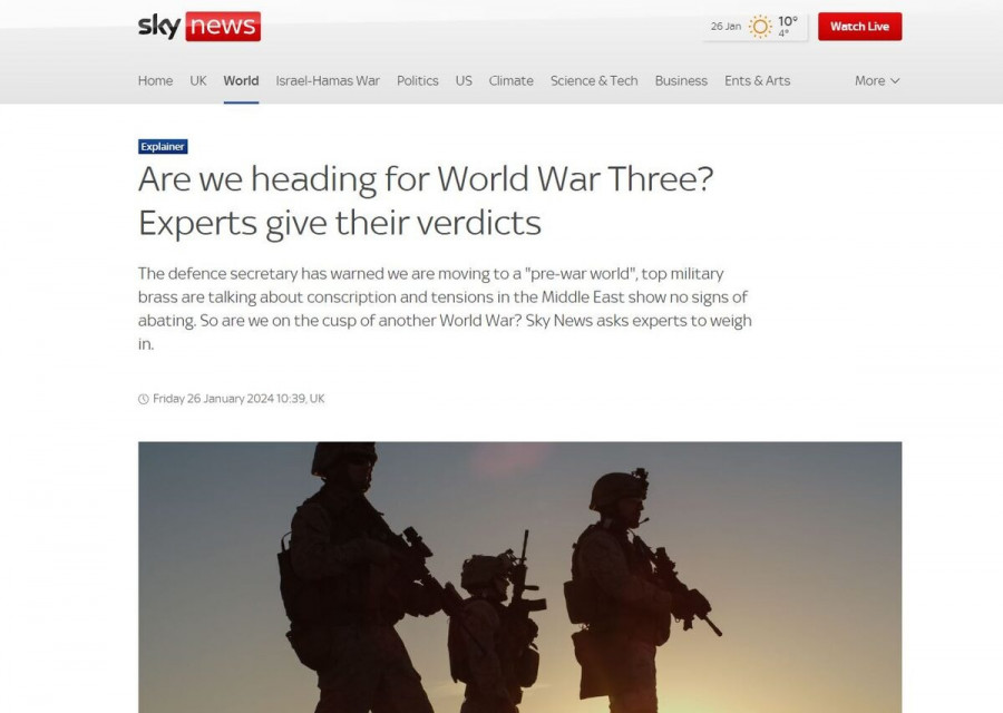 Οδεύουμε προς τον Τρίτο Παγκόσμιο Πόλεμο; Αυτό ειναι πλέον το μεγάλο ερώτημα που πλανάται, καθώς οι ειδικοί εξετάζουν εάν η Ρωσία, η Κίνα και η Μέση Ανατολή θα μπορούσαν να οδηγήσουν τον πλανήτη σε μία αποκαλυπτική σύγκρουση. Οι υπουργοί Άμυνας εκδίδουν προειδοποιήσεις, οι κορυφαίοι στρατιωτικοί λένε οτι οι εντάσεις στη Μέση Ανατολή δεν δείχνουν σημάδια υποχώρησης. Το Sky News ζήτησε τη γνώμη ειδικών για το εάν ο Τρίτος Παγκόσμιος Πόλεμος είναι μια πιθανότητα - και αν ζούμε πραγματικά σε έναν «προπολεμικό κόσμο».
