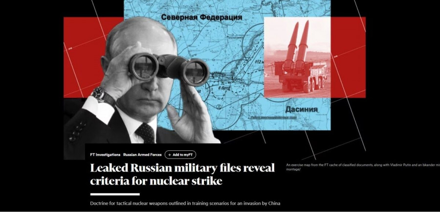 Αρχεία του ρωσικού στρατού που διέρρευσαν στους Financial Times αποκαλύπτουν κριτήρια για πυρηνική επίθεση. Περιγράφουν το δόγμα χρήσης τακτικών πυρηνικών όπλων και σενάρια εκπαίδευσης για μία υποθετική εισβολή από την Κίνα