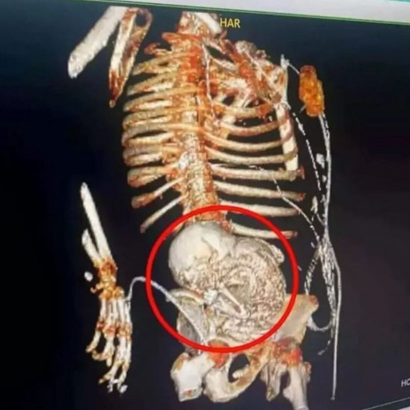 Αντίθετα, το νεκρό έμβρυο συγκρατείται στην κοιλιακή κοιλότητα, σχηματίζοντας ένα περίβλημα ασβεστίου γύρω του. Η τομογραφία λήφθηκε αφού μεταφέρθηκε επειγόντως στο Περιφερειακό Νοσοκομείο Ponta Pora στην κεντροδυτική πολιτεία Mato Grosso do Sul της Βραζιλίας με γενικευμένη λοίμωξη.