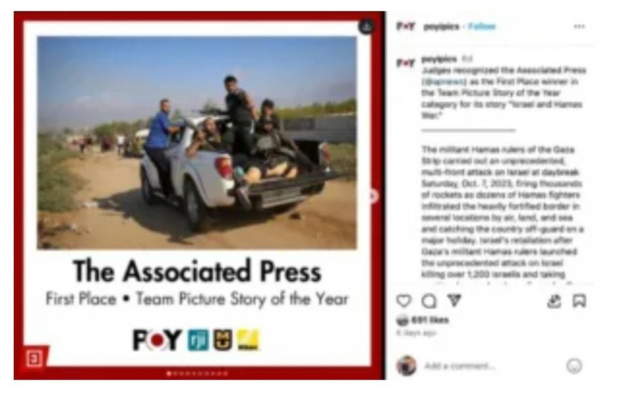 Η εικόνα της δολοφονημένης Σάνι Λουκ δίπλα σε τρομοκράτες της Χαμάς βραβεύτηκε ως η καλύτερη σε συγκεκριμένη κατηγορία. Η σκληρή και ωμή εικόνα με το πτώμα της 22χρονης Γερμανο-ισραηλινής ήταν ανάμεσα σε μια συλλογή από 20 εικόνες που βοήθησαν το ειδησεογραφικό πρακτορείο Associated Press να εξασφαλίσει την πρώτη θέση σε μια από τις κατηγορίες του διεθνούς βραβείου Pictures of the Year νωρίτερα αυτόν τον μήνα.