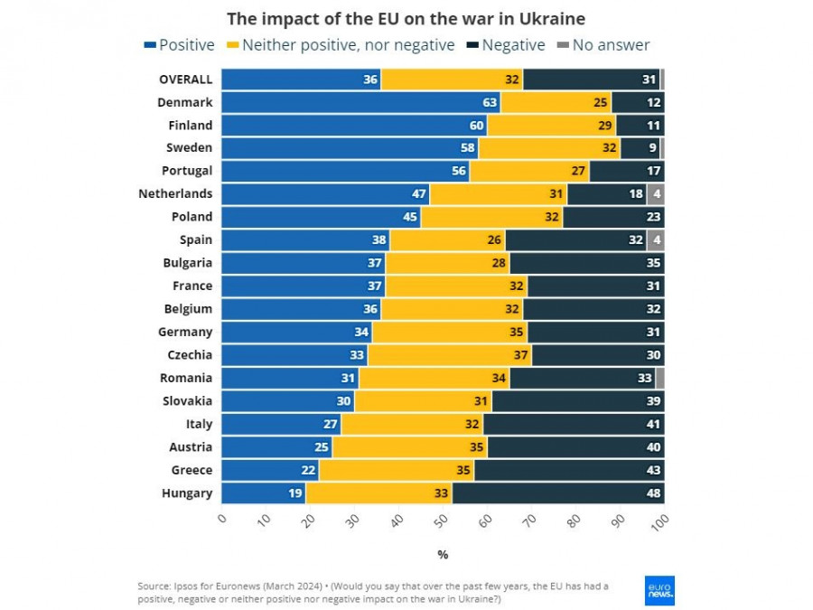 Οι ερωτηθέντες από τις σκανδιναβικές χώρες - 63% των Δανών, 60% των Φινλανδών, 58% των Σουηδών - έχουν θετική άποψη για τον αντίκτυπο που είχε η ΕΕ στη στήριξη της Ουκρανίας. Ο γαλλογερμανικός άξονας, εν τω μεταξύ, είναι μέτρια ικανοποιημένος: Το 37% των Γάλλων ερωτηθέντων έχει θετική γνώμη και το 31% αρνητική, περίπου το ίδιο με την απέναντι πλευρά του Ρήνου.