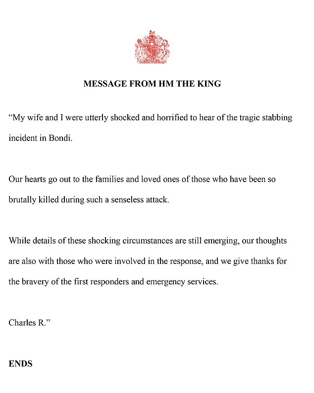 Ο βασιλιάς της Αγγλίας, ο οποίος είναι αρχηγός κράτους στην Αυστραλία, δήλωσε ότι τόσο ο ίδιος όσο και η σύζυγός του, βασίλισσα Καμίλα είναι «απόλυτα σοκαρισμένοι και τρομοκρατημένοι» από την επίθεση στο mall στο Σίδνεϊ με τους έξι νεκρούς.