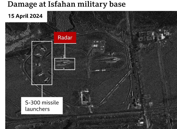 Το BBC Verify ανέλυσε δύο εικόνες που δείχνουν μέρος ενός συστήματος αεράμυνας σε αεροδρόμιο στο Ισφαχάν να έχει υποστεί ζημιά. Αμερικανοί αξιωματούχοι λένε ότι το Ισραήλ πραγματοποίησε μια πυραυλική επίθεση, αν και δεν έχει υπάρξει επίσημη επιβεβαίωση από το Ισραήλ.