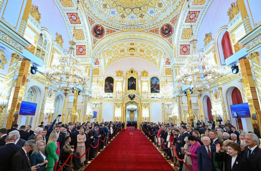 Στην τελετή μέσα στο χρυσοποίκιλτο Μεγάλο Παλάτι του Κρεμλίνου, ο Πούτιν έβαλε το χέρι του στο ρωσικό Σύνταγμα και ορκίστηκε να το υπερασπιστεί καθώς ένα πλήθος αξιωματούχων παρακολουθούσε. Η νέα του θητεία -η τρίτη συνεχόμενη φορά που εκλέγεται- θα τον οδηγήσει μέχρι το 2030.