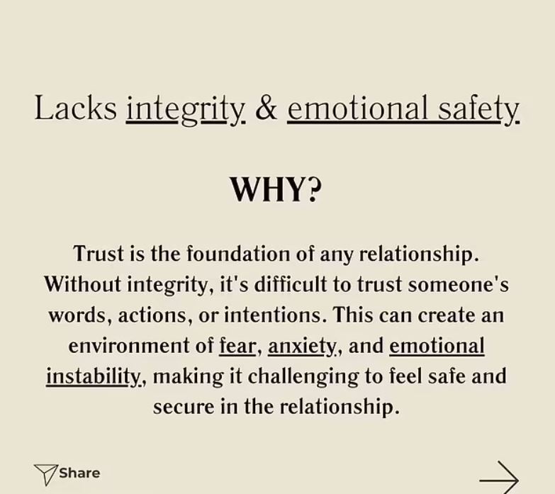 Η ανάρτηση συνεχίζει λέγοντας: «Η εμπιστοσύνη είναι το θεμέλιο κάθε σχέσης. Χωρίς ακεραιότητα, είναι δύσκολο να εμπιστευτείς τα λόγια, τις πράξεις ή τις προθέσεις κάποιου. Αυτό μπορεί να δημιουργήσει ένα περιβάλλον φόβου, άγχους και συναισθηματικής αστάθειας, καθιστώντας δύσκολο να αισθάνεσαι ασφάλεια στη σχέση».