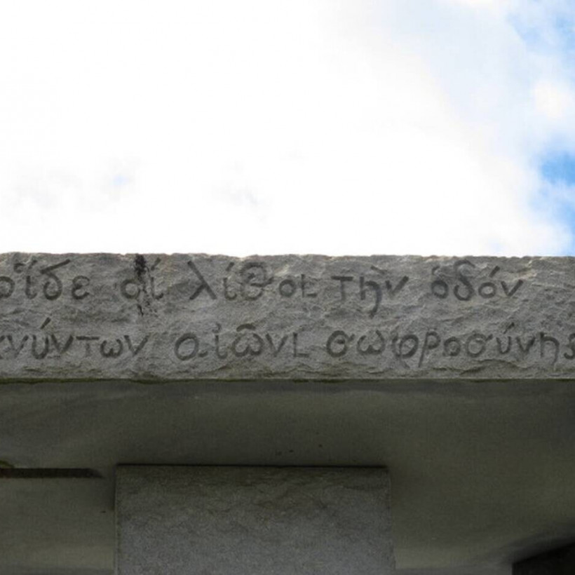 Ένα μικρότερο μήνυμα εμφανίζεται στις τέσσερις κάθετες επιφάνειες της κορωνίδας λίθου, σε διαφορετική γλώσσα και γραφή σε κάθε πλευρά. Στο ανατολικό της μέτωπο το μήνυμα στα Αρχαία Ελληνικά αναφέρει: "Οἵδε οί λίθοι τὴν ὀδὸν δεικνύντων αἰῶνι σωφροσύνης". Οι υπόλοιπες τρεις νεκρές γλώσσες του συγκεκριμένου μηνύματος είναι: Βαβυλωνιακή Σφηνοειδής (στα βόρεια), Σανσκριτικά (στα νότια), και Αιγυπτιακά Ιερογλυφικά (στα δυτικά).