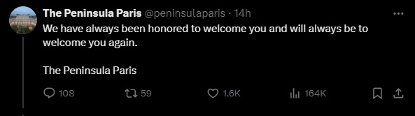«Αγαπητή κυρία Γουίλιαμς, παρακαλούμε δεχτείτε τη βαθύτατη συγγνώμη μας για την απογοήτευση που αντιμετωπίσατε απόψε. Δυστυχώς, το μπαρ στον τελευταίο όροφο του ξενοδοχείου μας ήταν όντως πλήρως κλεισμένο και τα μόνα κενά τραπέζια που είδατε, ανήκαν στο γκουρμέ εστιατόριό μας, L'Oiseau Blanc, το οποίο ήταν ρεζερβέ», απάντησε το ξενοδοχείο, προσθέτοντας «Είναι πάντα τιμή μας να σας υποδεχόμαστε και θα είναι πάντα τιμή μας να σας καλωσορίσουμε ξανά. The Peninsula Paris».
