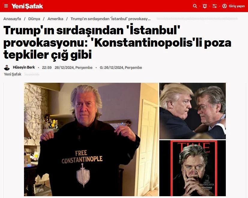 Αυτό φυσικά δεν άρεσε καθόλου στους Τούρκους, με τη Yeni Safak να κάνει λόγο για «πρόκληση» και «χιονοστιβάδα αντιδράσεων» για την αναφορά «Κωνσταντινούπολη» από «έμπιστο του Τραμπ»...