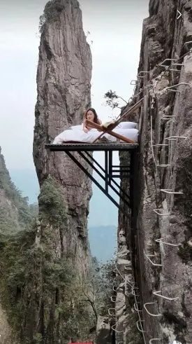 Ένα αξιοθέατο στην Κίνα που προκαλεί ακροφοβία ανεβάζει τη χαλάρωση σε νέο επίπεδο, επιτρέποντας σε τολμηρούς να ξεκουραστούν σε ένα κρεβάτι που βρίσκεται στην άκρη ενός γκρεμού σε ύψος άνω των 97.536 μέτρων.