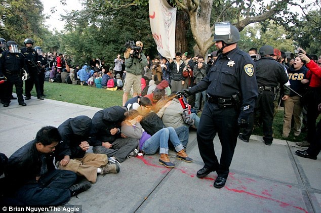 Ενώ οι φοιτητές πραγματοποιούν καθιστική διαμαρτυρία χωρίς να προκαλούν και να ενοχλούν τον αστυνομικό, αυτός τους ψεκάζει με ένα σπρέι πιπεριού.