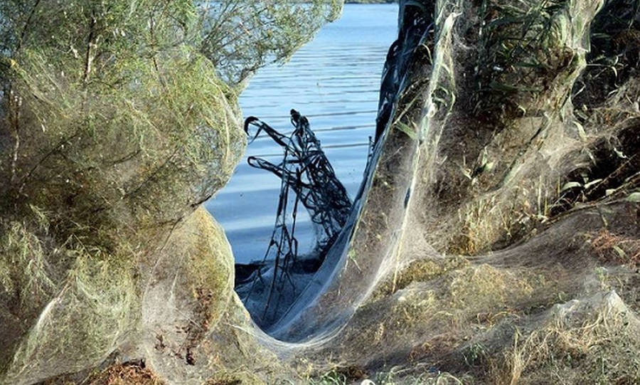 Πλάνα ταινίας θρίλερ θυμίζουν οι εικόνες με το γιγαντιαίο πέπλο αράχνης που έχει καλύψει φυτά αλλά και σπίτια στο Αιτωλικό.