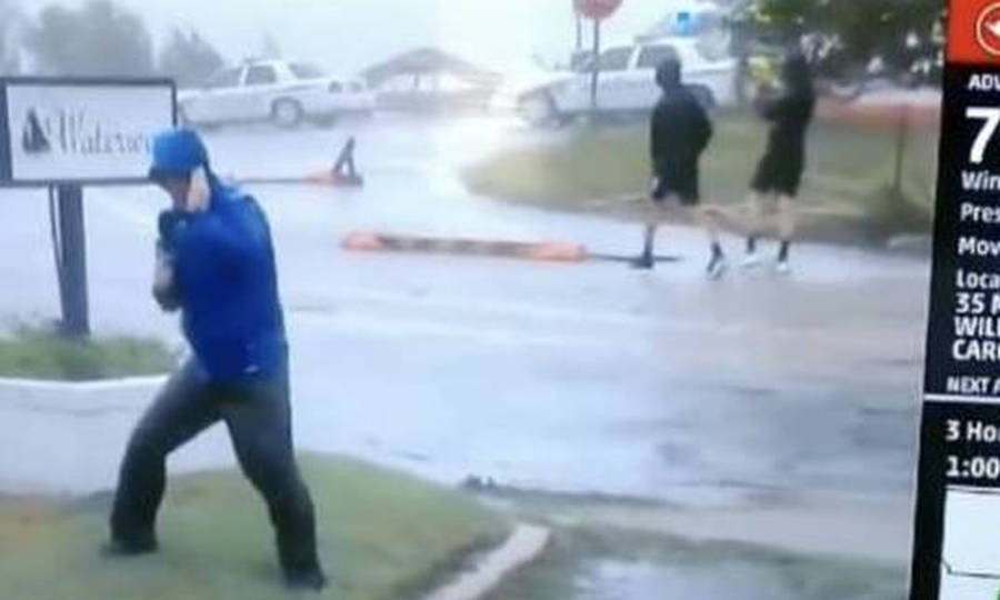 Ρεπόρτερ «παλεύει» με τον τυφώνα, την ώρα που πίσω του βολτάρουν... χαλαρά!