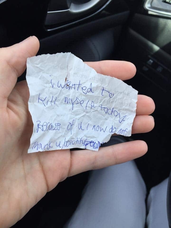 Μου είπε πολλά για το πώς οι άνθρωποι είναι συνήθως πολύ κακοί μαζί του επειδή είναι άστεγος πώς τα ναρκωτικά τον μετατρέπουν σε κάτι που μισεί, και πως έχασε τη μαμά του από καρκίνο. Τον έλεγαν Chris. Μου ζήτησε να περιμένω, ώστε να γράψει κάτι. Δίνοντας μου μια τσαλακωμένη απόδειξη, ανοιξα το σημείωμά του και αυτό ήταν. «Ήθελα να αυτοκτονήσω σήμερα, και δεν θα το κάνω εξαιτίας σου. Ευχαριστώ.»