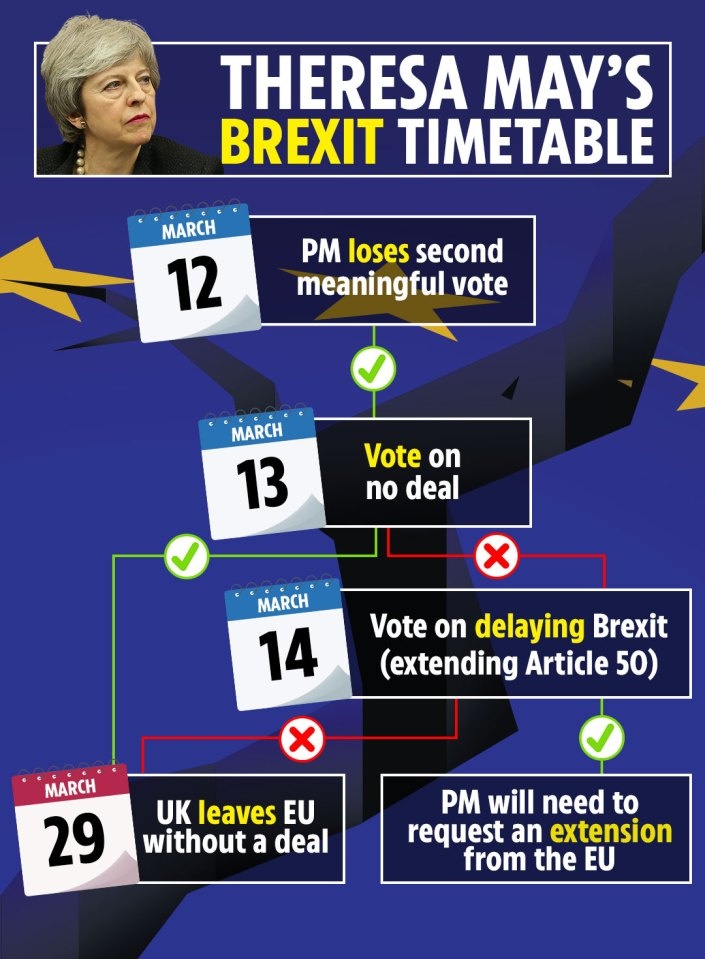 Τις επόμενες ημέρες οι Βρετανοί νομοθέτες θα ψηφίσουν εάν θέλουν να αποχωρήσουν από την Ευρωπαϊκή Ένωση χωρίς συμφωνία ή αν θα επιχειρήσουν να αναβάλουν τις διαδικασίες για το «διαζύγιο», που είναι προγραμματισμένο για τις 29 Μαρτίου. Η Τερέζα Μέι ήλπιζε να αποσπάσει το πολυπόθητο «ναι» σήμερα, καθώς η παραμονή της στην ηγεσία του Συντηρητικού Κόμματος και στην πρωθυπουργία κρίνεται πλέον αβέβαιη.