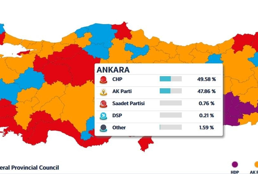 Στην Άγκυρα τα μέχρι στιγμής αποτελέσματα δείχνουν ανατροπή. Ο υποψήφιος της αντιπολίτευσης (CHP) για τη δημαρχία της Άγκυρας, Μανσούρ Γιαβάς, προηγείται του υποψηφίου του κυβερνώντος κόμματος (AKP) Μεχμέτ Οζασεκί, με καταμετρημένο το 50,32% των ψήφων, μετέδωσε το τηλεοπτικό κανάλι NTV.