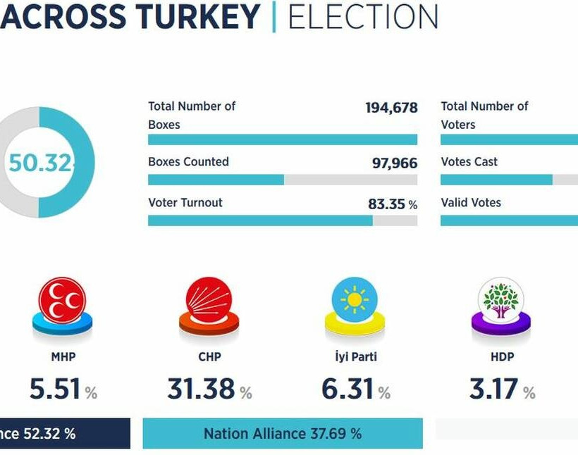Με την άρση της απαγόρευσης από το Ανώταστο Εκλογικό Συμβούλιο μεταδίδονται πλέον και επίσημα τα μέχρι στιγμής αποτελέσματα των δημοτικών εκλογών στην Τουρκία. Σύμφωνα με αυτά αν και το δείγμα δεν είναι ακόμη αρκετά αντιπροσωπευτικό για δημοτικές εκλογές ο Μπιναλί Γιλντιρίμ προηγείται στην Κωνσταντινούπολη να με 51,7% έναντι 45,6% του Εκρέμ Ιμάμογλου ενώ έχει καταμετρηθεί το 35% των ψήφων.