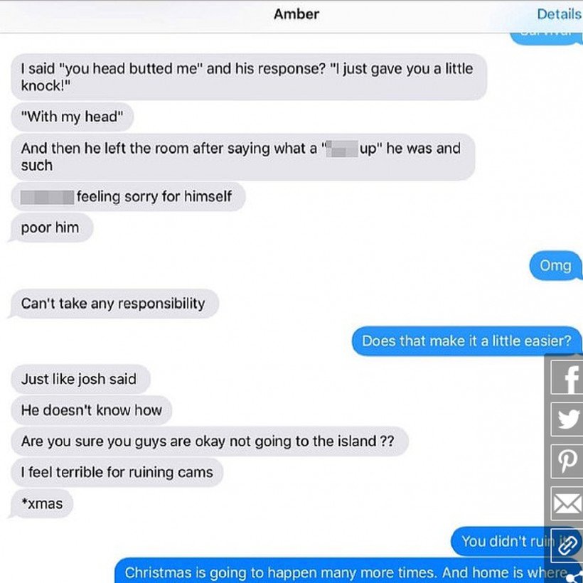 Το επόμενο πράγμα που θυμάται η Χερντ από εκείνον τον καβγά, όπως ισχυρίζεται η ίδια, είναι οι φίλοι της που μπήκαν στο σπίτι και την βρήκαν γεμάτη μελανιές. Είδαν τα μαλλιά της στο πάτωμα και το κρεβάτι σπασμένο.