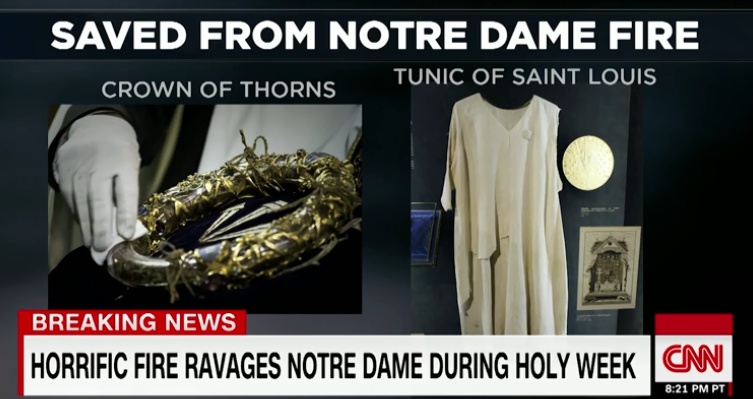 Νωρίτερα, η δήμαρχος του Παρισιού Αν Ινταλγκό, μέσω Twitter, είχε ευχαριστήσει όσους ανταποκρίθηκαν και σχηματίζοντας ανθρώπινη αλυσίδα με κίνδυνο της ζωής τους, προστάτεψαν τα αναντικατάστατα αντικείμενα στο εσωτερικό του ναού - μεταξύ αυτών και το «Ακάνθινο στεφάνι» που τοποθετήθηκε στο κεφάλι του Ιησού όσο βρισκόταν στον σταυρό.