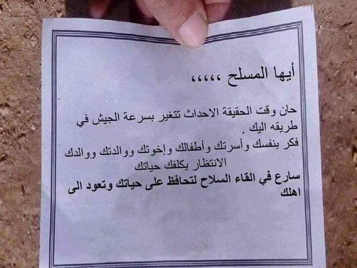 «Παραδώστε τα όπλα σας και πηγαίντε σπίτια σας με τους γονείς, τα παιδιά και τις οικογένειες σας καθώς ο Στρατός μας πλησιάζει» αναφέρουν τα φυλλάδια που ρίχνουν ελικόπτερα.