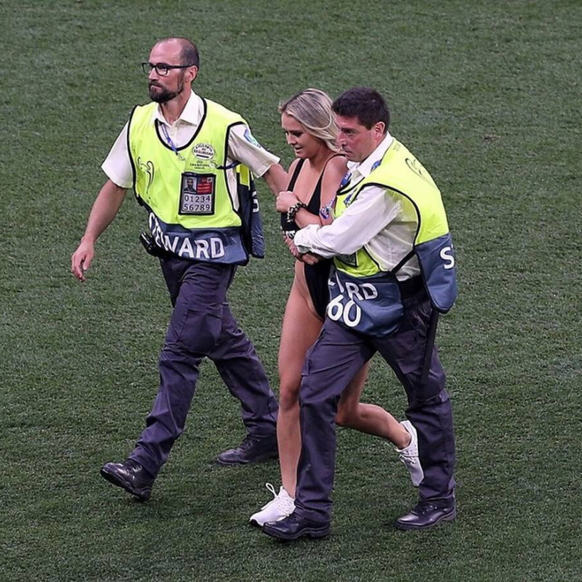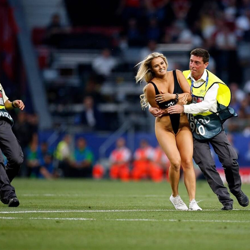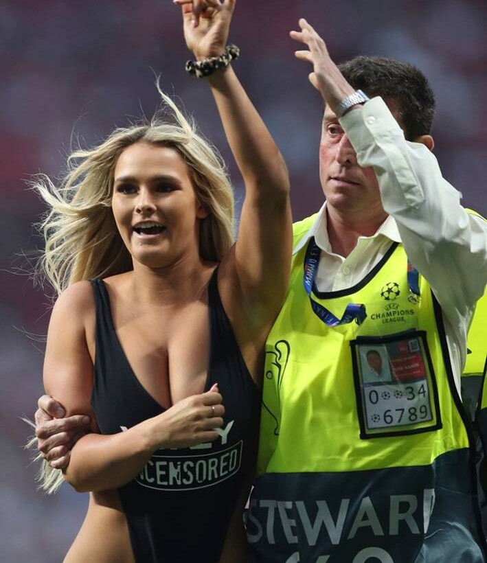Η ξανθιά καλλονή εισέβαλε στον αγωνιστικό χώρο λίγο πριν συμπληρωθεί το πρώτο εικοσάλεπτο του αγώνα Τότεναμ – Λίβερπουλ και τον διέκοψε για λίγα δευτερόλεπτα, μαγνητίζοντας όλα τα βλέμματα με το αποκαλυπτικό μαγιό και τα πλούσια προσόντα της.