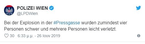 Συναγερμός στην Βιέννη μετά από ισχυρή έκρηξη. Σύμφωνα με την τοπική αστυνομία, κατέρρευσαν αρκετοί όροφοι από δύο πολυώροφα κτήρια, έπειτα από έκρηξη αερίου, πιθανώς.