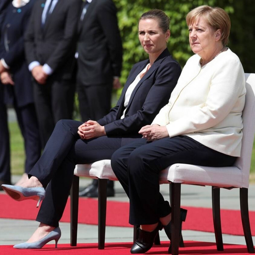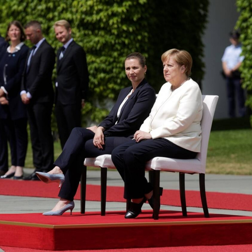 Η Δανή πρωθυπουργός Μέτε Φρέντρικσεν κάθισε δίπλα στη Μέρκελ κατά την υποδοχή με στρατιωτικές τιμές που της επιφυλάχθηκε στο Βερολίνο, πριν οι δύο γυναίκες βαδίσουν προς την καγκελαρία. Η Μέρκελ δεν φάνηκε να τρέμει και χαμογελούσε πλατιά.