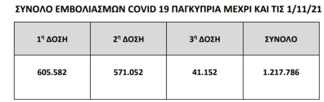Σύμφωνα με τα στοιχεία, μέχρι την 1η Νοεμβρίου είχε εμβολιαστεί πλήρως το 79,9% (571.052 άτομα) του ενήλικου πληθυσμού, ενώ με τουλάχιστον την πρώτη δόση εμβολίου το 82,2% (605.582 άτομα).