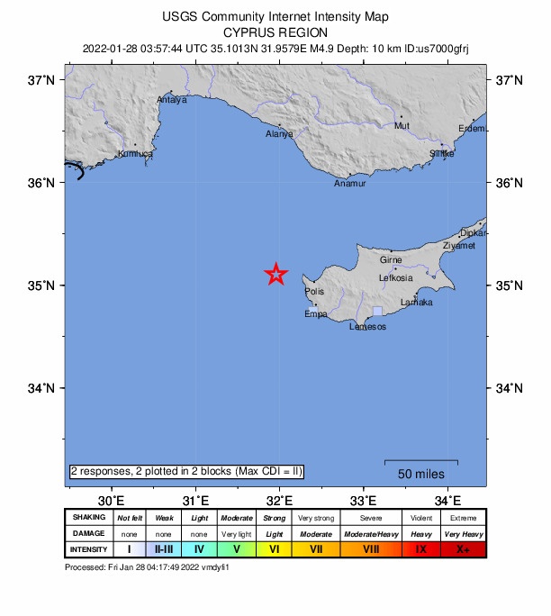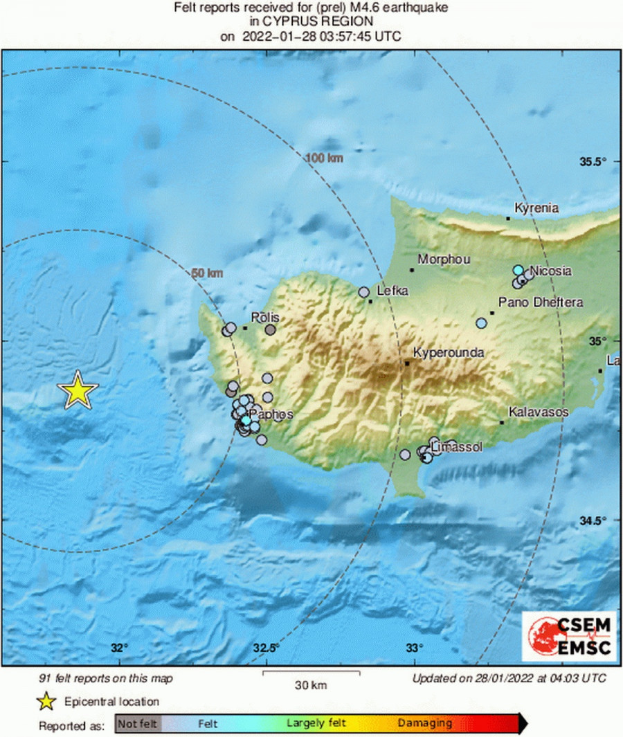 Σεισμός ΤΩΡΑ: Σεισμική δόνηση μεγέθους 4,9 βαθμών της κλίμακας Ρίχτερ (σύμφωνα με την αυτόματη λύση του Ευρωπαϊκού EMSC), σημειώθηκε τα ξημερώματα της Παρασκευής (28/1), στις 05:57 σε υποθαλάσσια περιοχή, δυτικά της Κύπρου.