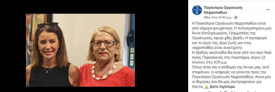 Την Άννα Χατζηγεωργίου, Γραμματέα Παγκύπριας Οργάνωσης Νεφροπαθών, αποχαιρετά η Ομοσπονδία Συνδέσμων Ασθενών Κύπρου (ΟΣΑΚ) με ανακοίνωσή της, εκφράζοντας τα συλλυπητήριά της στην οικογένεια και τους οικείους της για την απώλειά της.