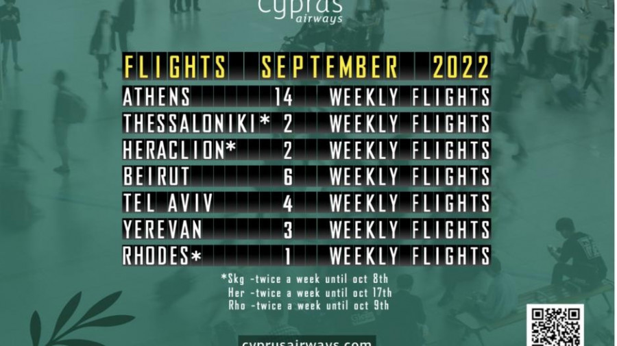 Οι Κυπριακές Αερογραμμές θα ανακοινώσουν σύντομα το χειμερινό πρόγραμμα πτήσεων 2022/23 με νέες πτήσεις προς τους πιο δημοφιλείς προορισμούς με την καλύτερη σχέση ποιότητας-τιμής. Περισσότερες πληροφορίες θα είναι διαθέσιμες στο www.cyprusairways.com.