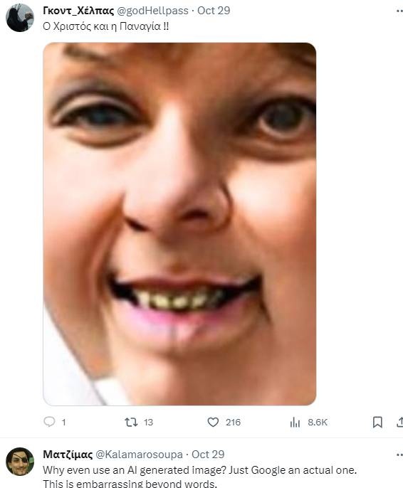 Η βουλευτής θέλησε να ευχηθεί για την Εθνική Επέτειο του ΟΧΙ, ανεβάζοντας φωτογραφία στο Twitter... τεχνητής νοημοσύνης. Το παιδάκι δεν είναι πραγματικό αλλά δημιούργημα AI και ακόμα πιο σοκαριστικό είναι ότι η ελληνική σημαία έχει σχεδιαστεί με τρεις ρίγες.