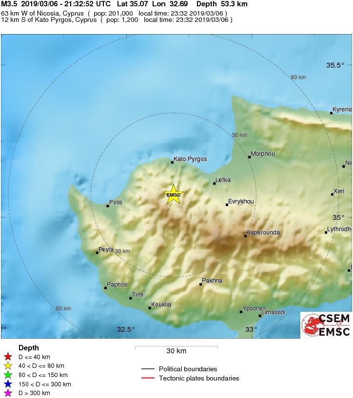 Το ακριβές επίκεντρο της δόνησης εντοπίζεται στα 63χλμ. δυτικά της Λευκωσίας και 12χλμ. νότια του Κάτω Πύργου σύμφωνα με το EMSC.