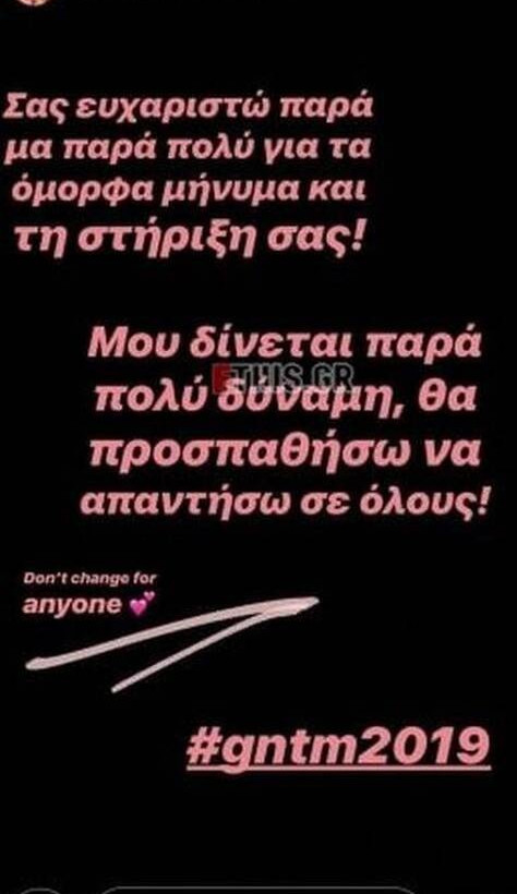 «Σας ευχαριστώ πάρα μα πάρα πολύ για τα όμορφα μηνύματα και τη στήριξή σας. Μου δίνετε πάρα πολύ δύναμη, θα προσπαθήσω να απαντήσω σε όλους. Μην αλλάξετε για κανέναν».