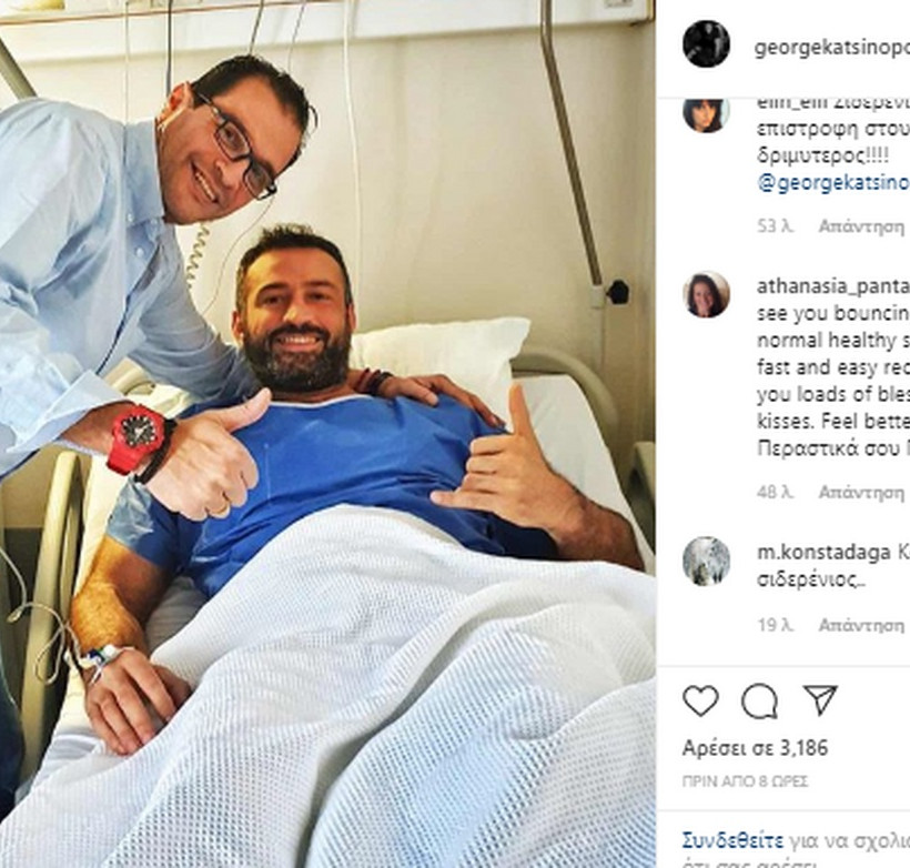 Την φωτογραφία (από το νοσοκομείο), που ανέβασε ο Γιώργος Κατσινόπουλος, συνόδεψε με την παρακάτω λεζάντα: «Ένα δύσκολο χειρουργείο έλαβε τέλος… Τα τελευταία 2 χρόνια προσπαθώντας να αποφύγω μια εγχείρηση στο αριστερό μου ισχίο, εξαντλώντας εναλλακτικές θεραπείες, έμεινα εκτός αγωνιστικών υποχρεώσεων εντός κι εκτός Ελλάδας! Μετά από πολλές συζητήσεις καταλήξαμε με τον γιατρό μου, Ζακ Μελάγιες πως η εισαγωγή μου στο χειρουργικό κρεβάτι ήταν μονόδρομος.. Σήμερα, μετά από ένα χειρουργείο διάρκειας 5 ωρών εξήλθα από την Κεντρική Κλινική Αθηνών όπου υπεβλήθηκα σε αρθροσκόπηση της Αριστερής κατ´ ισχιον άρθρωσης λόγω έντονης δυσκαμψίας κ άλγους , εξαιτίας ελεύθερων οστεοχονδρινών τεμαχίων κ ύπαρξης πολλών οστεοφύτων, τα οποία και αφεραίθησαν με επιτυχία.