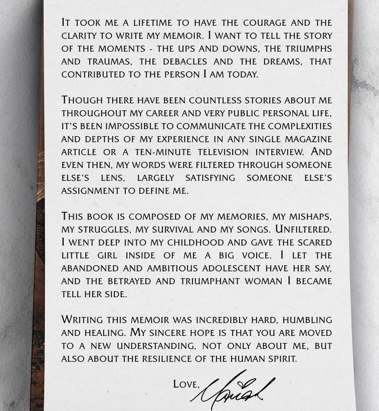 «Μου πήρε σχεδόν μια ζωή για να αποκτήσω το κουράγιο και τη νηφαλιότητα να γράψω τη βιογραφία μου», σχολίασε η τραγουδίστρια στην σχετική λεζάντα κάτω από την φωτογραφία που πόσταρε στον προσωπικό της λογαριασμό στο Instagram. Σε ένα άλλο post της, έβαλε το εξώφυλλο της βιογραφίας της, στην οποία αφηγείται τα παθήματά της, τους «αγώνες» της, την επιβίωσή της αλλά και ιστορίες για τα τραγούδια της.