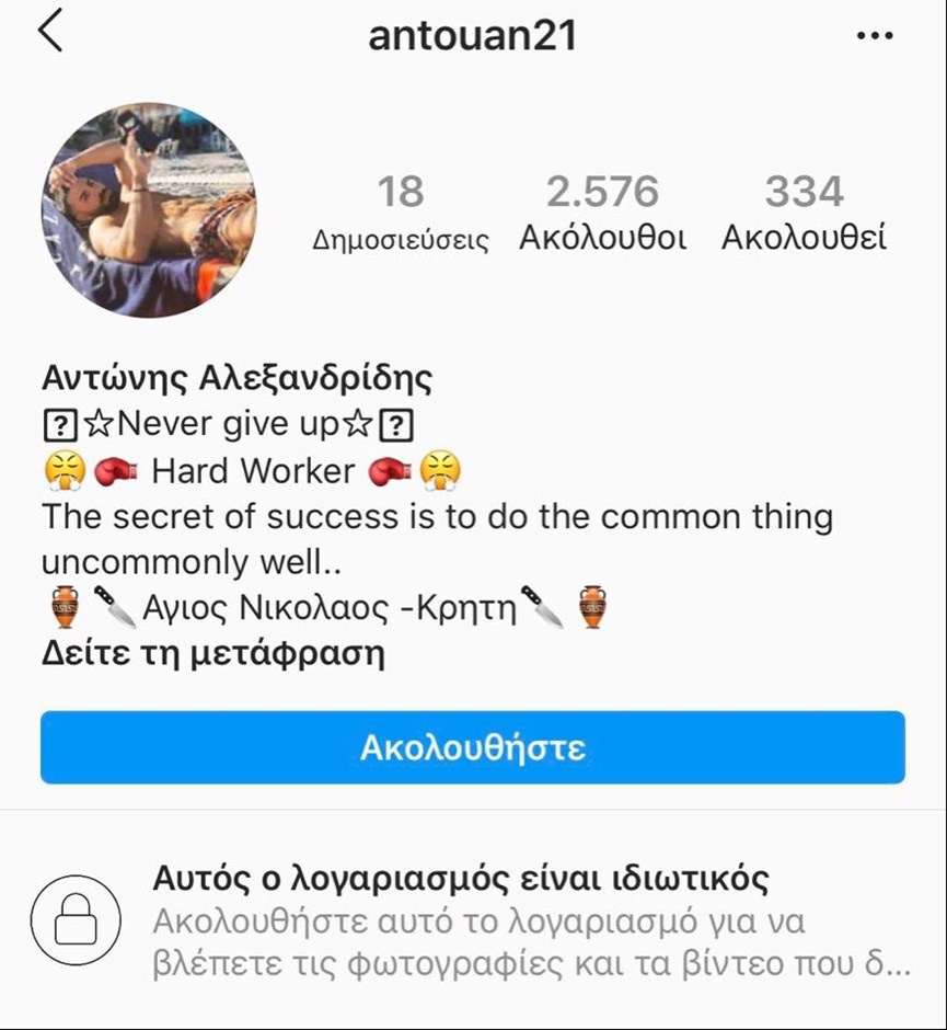 Το πρώτο πράγμα που έκανε ο Αντώνης Αλεξανδρίδης μετά την αποχώρησή του από το Big Brother, ήταν να μπει στο προσωπικό του λογαριασμό στο Instagram. Ο Κρητικός είχε το προφίλ του δημόσιο και έτσι ο καθένας μπορούσε να μπει και να δει φωτογραφίες του αλλά και να σχολιάσει.